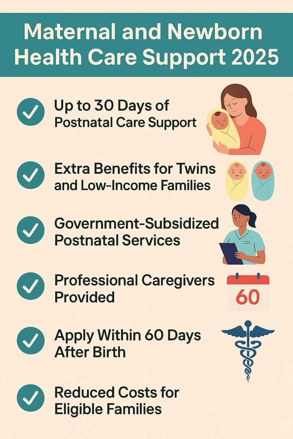 정부 지원으로 최대 30일까지 산후도우미 서비스를 받을 수 있는 기회, 특히 쌍둥이 출산 가정과 저소득층 가정은